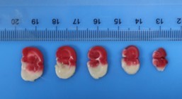 1)迅速将大鼠大脑取出,用冷盐水冲洗后,快速放于-20℃冰箱中放置10分钟,待脑组织稍硬后,取出切掉嗅球、垂体、低位脑干,由前向后冠状切片,均匀切成2 mm厚脑片,等分切成5片,置于1%TTC溶液中,37℃避光孵育30分钟,每隔5分钟左右翻动一次。TTC可与正常组织内的脱氢酶系统反应被还原为玫瑰红色,因此使组正常组织染呈玫瑰红色,梗死组织呈白色。